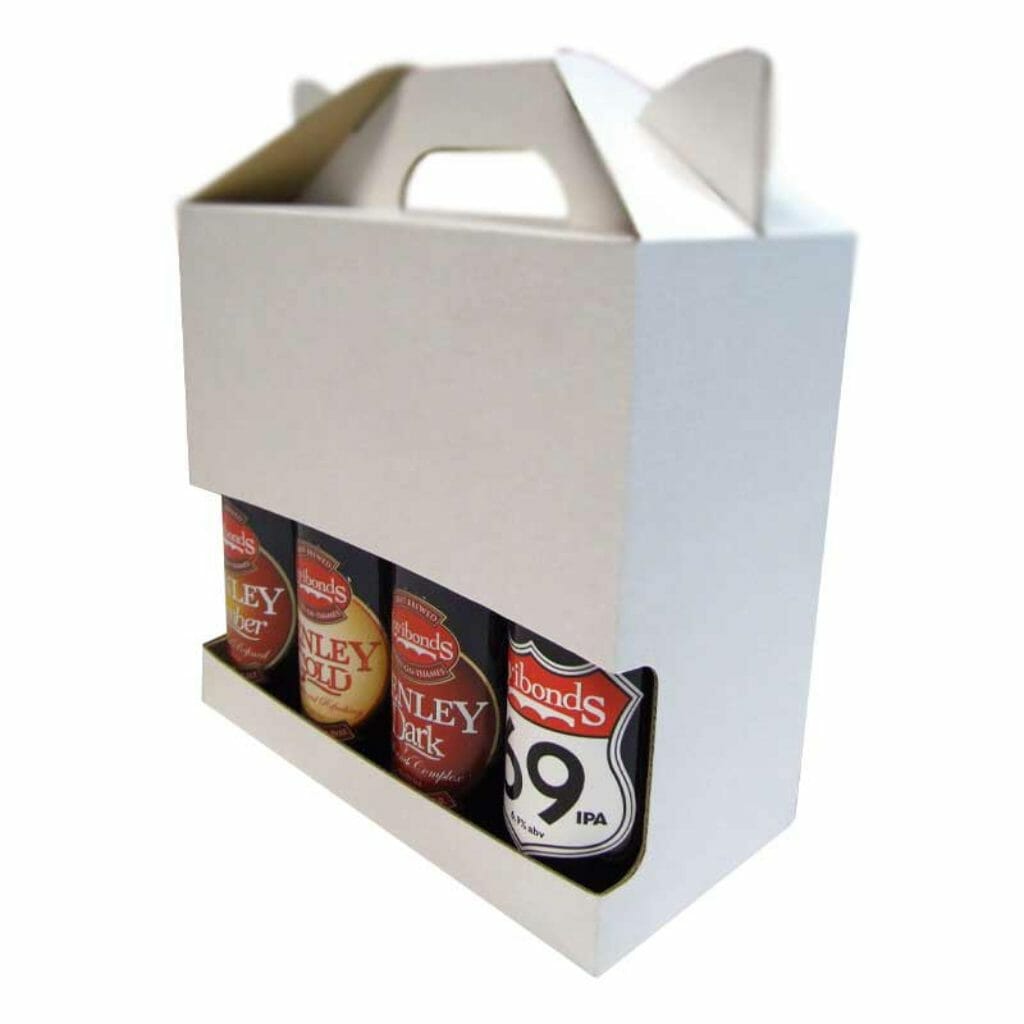 Bottle carriers use a durable and robust corrugated cardboard material. The exact grade (single or double wall) depends upon the amount, size and weight of bottles you wish to include. You can also choose between white and kraft (brown) materials.